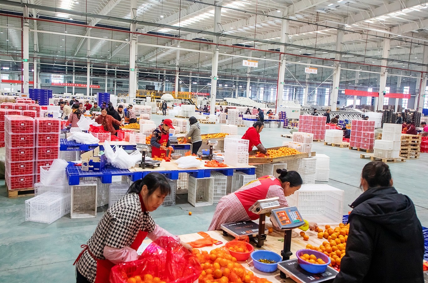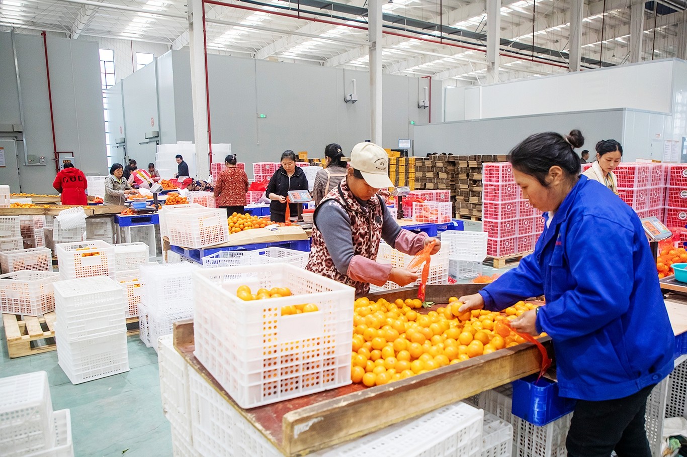 近日,重庆(忠县)现代农业柑橘产业园柑橘分拣中心,数十名工人在紧张包装柑橘鲜果,呈现出一派繁忙生产景象。