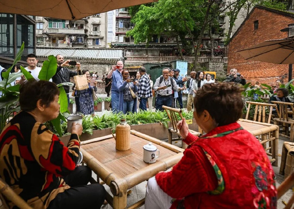 ▲2025年4月22日,九龙坡区谢家湾街道民主村社区,外国媒体记者参观民情坝坝茶。记者 龙帆 摄/视觉重庆