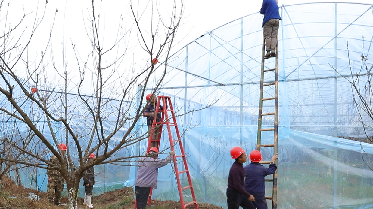 12月14日,在重庆市合川区盐井街道石马村集体经济蜂糖李大棚施工现场,工人正在固定钢架、安装薄膜等,现场一派忙碌的景象。2020年,石马村以“集体+村民入股”的方式,大力发展蜂糖李种植。为确保蜂糖李增产,百姓增收,今年,石马村投入资金300余万元,为200余亩蜂糖李搭建大棚、安装防鸟网,工程将于2024年1月底完工。