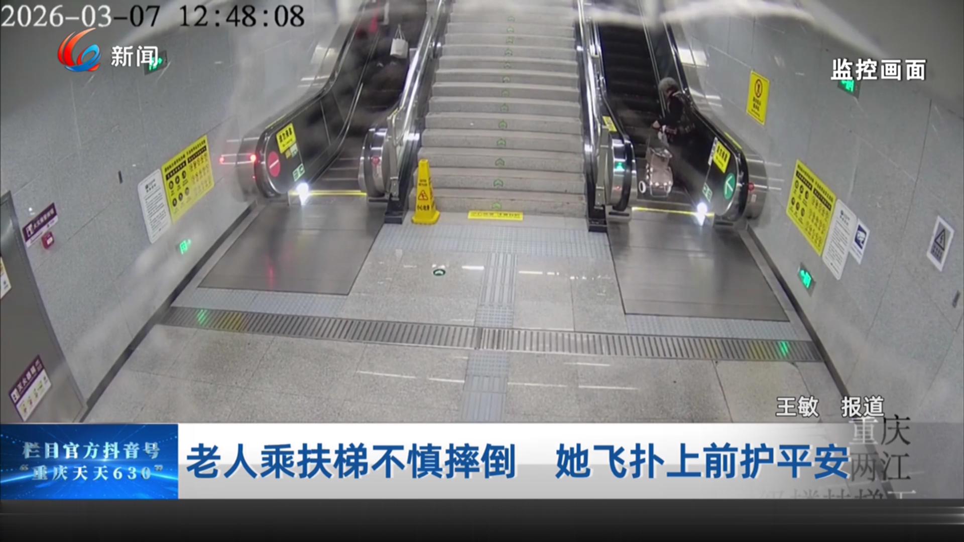 老人乘扶梯不慎摔倒 她飞扑上前护平安