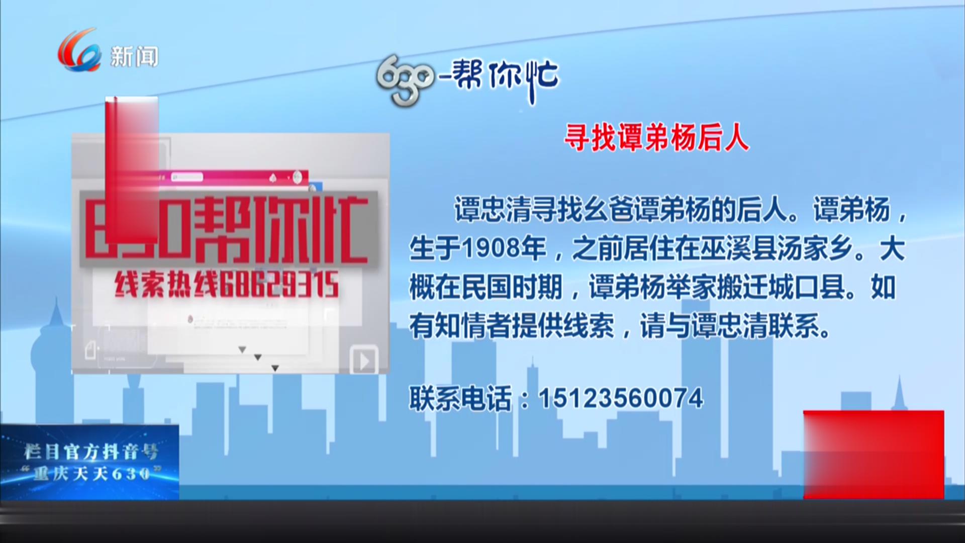 今天的630帮你忙,我们要帮一位来自巫溪的谭忠清老人,寻找失散多年的亲人。
