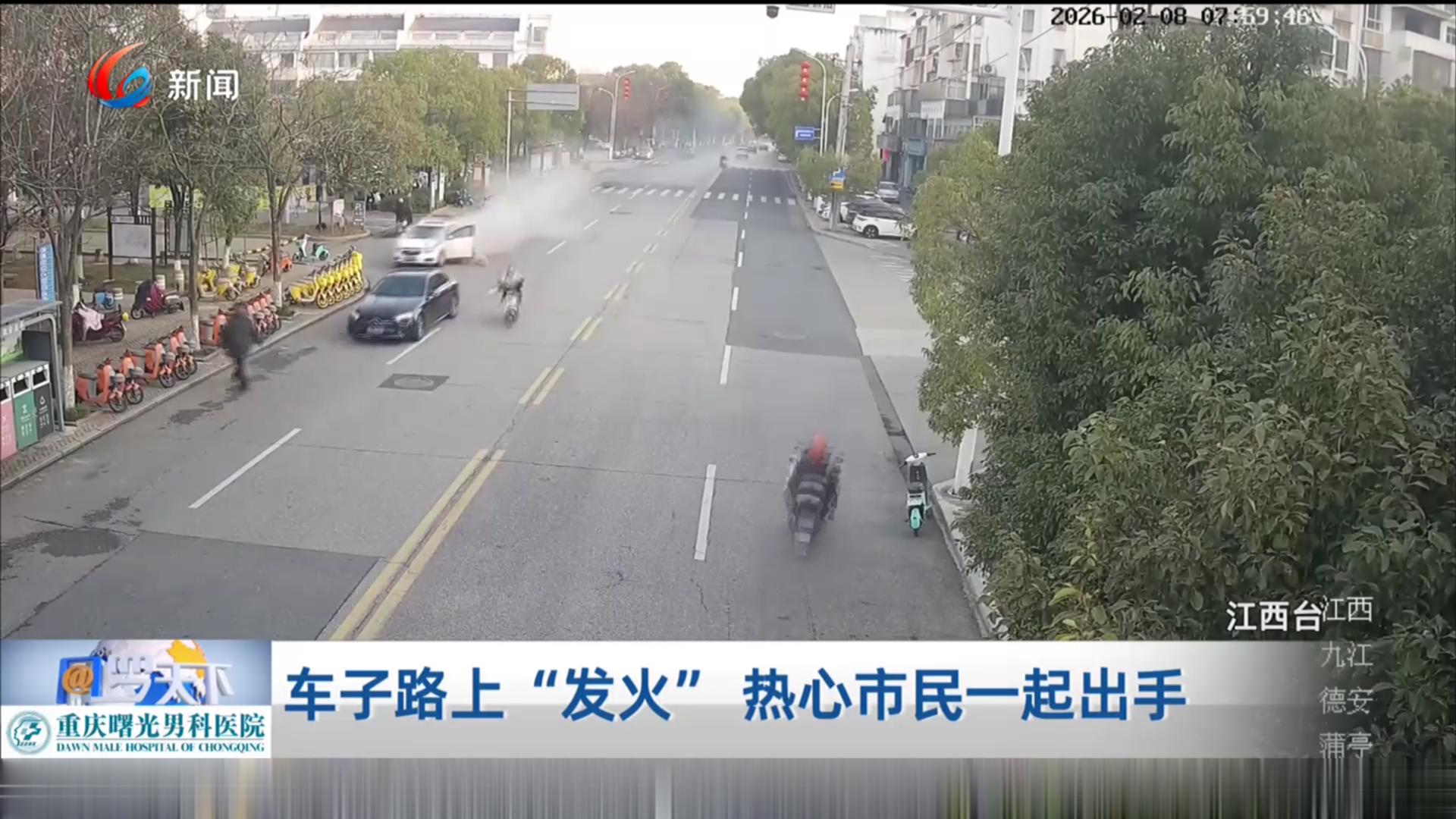 同样发生险情的还有江西德安县的一辆白色小车。它在行驶途中,突然冒起了浓烟,眼瞅着就要烧起来。危急时刻,四位开车路过的市民,用灭火器接力扑救,避免了火势扩大。