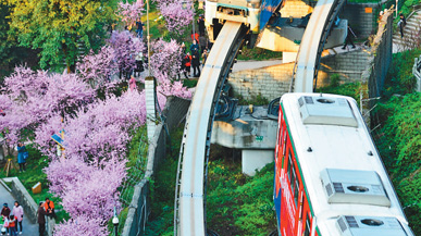 春暖花开,万物复苏。近日,重庆轨道交通2号线佛图关段,大面积的美人梅盛开,单轨列车穿行在花海中,成为一道亮丽的风景线。