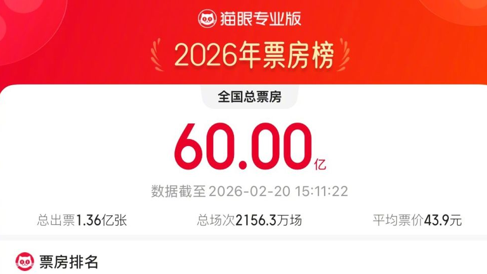 据网络平台数据,截至2月20日15时07分,2026年年度电影总票房(含预售)突破60亿!截至目前,春节档电影总票房(含预售)已突破34亿元。其中,《飞驰人生3》《惊蛰无声》《熊出没·年年有熊》位列前三。
