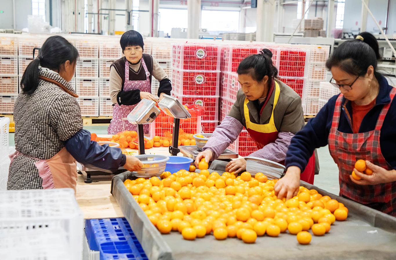 近日,重庆(忠县)现代农业柑橘产业园柑橘分拣中心,数十名工人在紧张包装柑橘鲜果,呈现出一派繁忙生产景象。